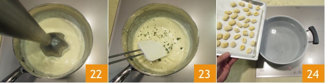 Bata o molho com um mixer de imersão para deixá-lo mais fluido 22. Aromatize com as folhas de tomilho 23 e a pimenta. Cozinhe agora os nhoques 24 por alguns minutos.