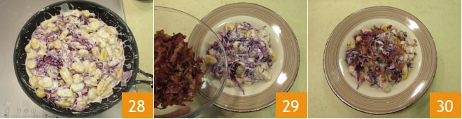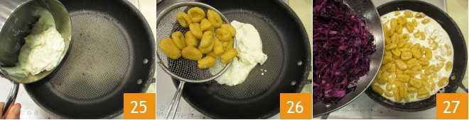 Enquanto isso, transfira o molho de Grana Padano para uma frigideira ampla 25; à medida que os nhoques subirem à superfície, escorra-os diretamente na frigideira com o tempero 26. Agora adicione o repolho roxo salteado 27.