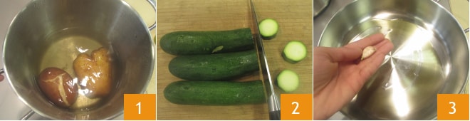 Para preparar os nhoques de abobrinha, comece colocando as batatas para ferver por cerca de 50 minutos ou até que estejam macias 1. Teste o cozimento com os dentes do garfo para se orientar melhor. Enquanto isso, lave as abobrinhas, corte as pontas e fatie em rodelas 2, você obterá cerca de 515 g. Em uma frigideira, coloque o óleo e o alho 3, deixe aromatizar por alguns instantes,