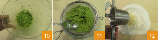 para criar um purê 10, depois passe-o por uma peneira 11 e reserve para esfriar. Agora, coloque a farinha sobre a bancada, adicione as batatas cozidas, já frias, passadas no espremedor de batatas 12.