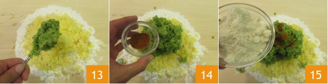 Adicione o purê de abobrinha 13, a páprica 14 e o queijo ralado 15.