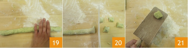 A massa ficará muito delicada e macia, pegue um pedacinho de massa e forme rolinhos. Corte os rolinhos em pedaços de cerca de 2 cm 20 e passe delicadamente os nhoques na ferramenta apropriada para fazer ranhuras 21. Cubra uma bandeja com um pano limpo e polvilhado com farinha, coloque os nhoques com espaçamento adequado. Continue assim até terminar a massa e depois proceda com o cozimento, acompanhando os nhoques de abobrinha com os condimentos que preferir!