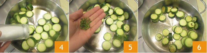 em seguida, adicione as abobrinhas. Salgue 4, apimente, aromatize com as folhas de tomilho 5 e cozinhe as abobrinhas por cerca de 10 minutos em fogo médio, ou até que estejam cozidas. O tempo varia de acordo com o tamanho das abobrinhas 6.