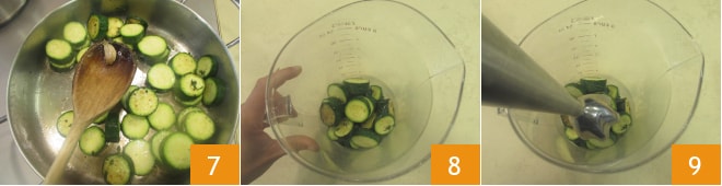 Retire o alho 7, coloque as abobrinhas em um copo alto 8 e triture com o mixer de imersão 9,