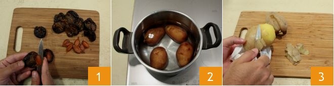 Para preparar os nhoques de ameixa, comece pegando as ameixas e retirando os caroços com uma faca 1. Se estiver usando ameixas secas bastante secas, coloque-as de molho em água morna para reidratá-las, depois esprema-as delicadamente e só depois retire os caroços. Após esse procedimento, deixe as ameixas de lado. Lave bem as batatas em água corrente fria e cozinhe-as inteiras com casca em bastante água salgada 2. Após 40-45 minutos, verifique se as batatas estão cozidas espetando-as com um garfo; se as batatas estiverem macias e bem cozidas, desligue o fogo e escorra-as delicadamente da água; em seguida, descasque-as ainda quentes 3.