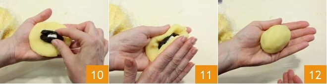 Divida a massa em 12 partes iguais com peso de 60 g cada e forme bolas que você irá achatar na palma das mãos, obtendo assim discos. Após essa etapa, coloque no centro de cada disco uma ameixa sem caroço, dentro da qual você colocará meia cubo de açúcar (ou uma pequena colher de açúcar) 10. Feche delicadamente cada disco com as mãos 11 até formar bolas de tamanho igual 12.