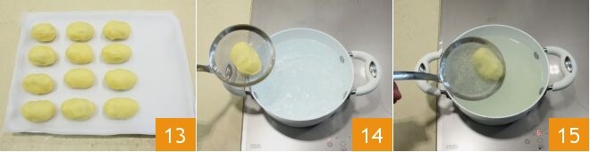 Repita a operação e, quando tiver terminado, coloque os nhoques de ameixa que você obteve em uma bandeja forrada com papel manteiga 13. Quando a água atingir o ponto de ebulição, cozinhe os nhoques 14 e escorra-os à medida que subirem à superfície 15;