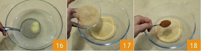 deixe-os então esfriar em água fria, mergulhando-os com uma peneira 16. Agora, prepare a cobertura: em uma tigela, coloque a farinha de rosca, o açúcar mascavo 17, a canela 18, e misture bem com uma colher.