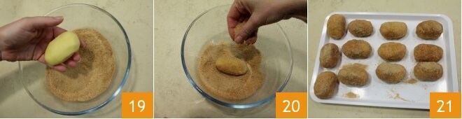 Passe delicadamente os nhoques de ameixa na cobertura que você obteve 19, garantindo que adira bem de maneira uniforme 20. Repita a operação e coloque os nhoques empanados em uma bandeja 21.