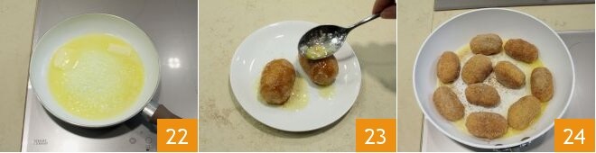 Por fim, coloque no fogo uma frigideira antiaderente com a manteiga 22; uma vez derretida, você pode escolher se deseja regar os nhoques de ameixa com a manteiga derretida 23 ou fritá-los na frigideira até que fiquem bem dourados 24. Além disso, outra variação consiste em dourar a farinha de rosca com a manteiga e a canela e depois mergulhar os nhoques, fritando-os alguns segundos para dar sabor. Sirva os nhoques de ameixa bem quentes.