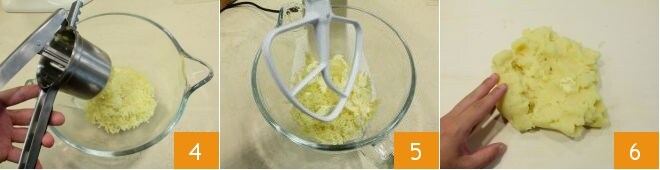Em seguida, passe-as pelo passa-verduras ou pelo espremedor de batatas 4 e coloque o purê na batedeira. Adicione a manteiga em temperatura ambiente em pedacinhos e ligue a pá 5 (caso não tenha uma batedeira, trabalhe a massa em uma superfície com as mãos); quando tiver obtido uma mistura homogênea, transfira o purê de batatas para uma superfície 6.