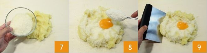 Adicione então o parmesão ralado 7, a gema de ovo e a farinha 8; com uma espátula misture tudo delicadamente por no máximo 5-6 minutos, sem sovar excessivamente 9, até obter uma mistura macia e consistente. Se a massa estiver muito mole ou pegajosa, adicione outra colher de farinha (o resultado depende muito do tipo de batata que você utilizou). Enquanto isso, coloque no fogo uma panela com bastante água salgada, que será usada para cozinhar os nhoques.