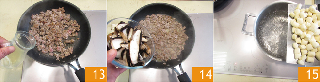 Deglace com o vinho branco 13 e, quando o vinho evaporar, adicione os cogumelos 14, deixe cozinhar por cerca de 3-5 minutos. Enquanto isso, coloque água para ferver e cozinhar os nhoquinhos 15.