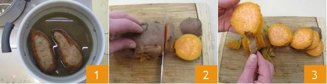Para preparar os nhoques de batata-doce, cozinhe as batatas com casca por 20 minutos 1, elas devem estar cozidas apenas por fora, terminando o cozimento no forno para secá-las, evitando que liberem água na massa. Ao terminar o cozimento, escorra as batatas e corte-as em rodelas com cerca de 1 cm de espessura 2, retire a casca 3.