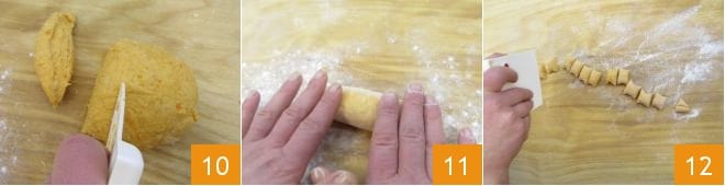 Em seguida, com uma espátula, divida a massa em pedaços 10 e crie cilindros com 2-3 centímetros de espessura 11, comece a cortar seus nhoques colocando-os em uma superfície 12 ou em uma bandeja enfarinhada.