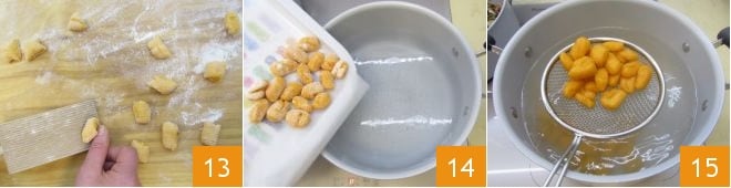 Por fim, faça as características ranhuras dos nhoques deslizando cada nhoque sobre a tábua própria 13 ou sobre o garfo, pressionando um pouco, mas não muito. Os nhoques estão prontos para serem cozidos: coloque no fogo uma panela cheia de água salgada e leve ao ponto de ebulição, mergulhe os nhoques 14 e cozinhe por alguns minutos, escorra-os quando começarem a flutuar na superfície 15. Seus nhoques estão prontos para serem acompanhados com os molhos e os temperos que preferir 16!