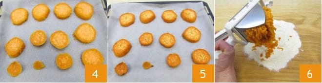 Coloque-as em uma assadeira forrada com papel manteiga 4 e asse em forno ventilado pré-aquecido a 180°C por 30 minutos (ou em forno estático a 200°C por 20 minutos). Ao terminar o cozimento 5, passe as batatas pelo espremedor para reduzi-las a um purê e junte-as à farinha peneirada em uma superfície 6, adicione uma pitada de sal.