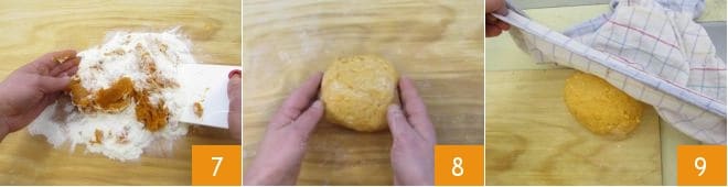 Neste ponto, você pode trabalhar a massa 7 até obter uma mistura compacta, dando-lhe a forma de um bloco 8 e cobrindo-o com um pano 9.