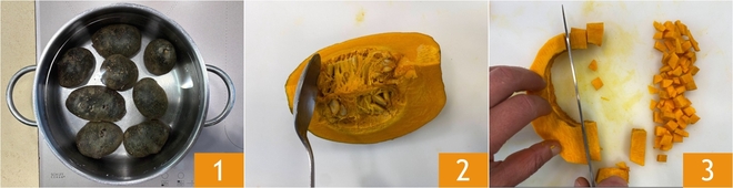 Para preparar os nhoques de batata roxa com creme de abóbora e couve, primeiro cozinhe as batatas roxas em água fria, o que levará cerca de 40-50 minutos, dependendo do tamanho delas 1. Enquanto isso, limpe a abóbora 2 e corte a polpa em cubos 3.