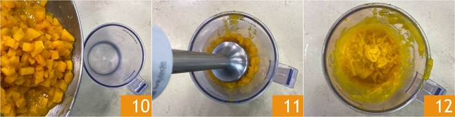 Transfira a abóbora para um copo medidor 10 e bata com um mixer de imersão 11 até obter um creme 12.