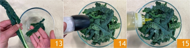 Mantenha o creme de abóbora quente e passe para a couve: separe as folhas dos talos 13 e coloque-as em uma tigela, depois tempere com sal 14 e azeite 15.