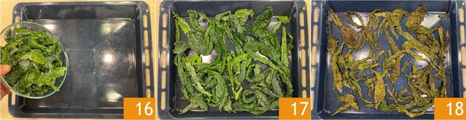 Distribua as folhas de couve em uma assadeira 16 e asse em forno ventilado pré-aquecido a 200° por cerca de 15 minutos 17. Após esse tempo, as folhas devem estar secas e crocantes 18.