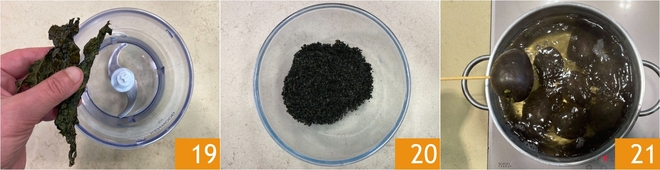 Deixe esfriar levemente, depois transfira a couve para um mixer 19 e triture para transformá-la em pó 20. Reserve o pó de couve e escorra as batatas, que, entretanto, estarão cozidas, verificando a consistência com um palito 21.