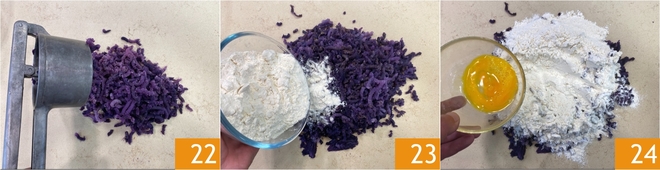 Amasse as batatas na superfície de trabalho (a casca ficará dentro do espremedor de batatas) 22, depois adicione a farinha 23, o ovo 24 e uma pitada de sal.