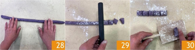 Estenda com as pontas dos dedos cada porção de massa para formar rolinhos com cerca de 2 cm de espessura 28. Ajude-se polvilhando de vez em quando a superfície de trabalho com semolina e cubra com um pano a porção de massa que não estiver sendo trabalhada para evitar que seque. Corte os rolinhos em toquinhos 29 e passe-os sobre uma tábua para nhoque polvilhada com semolina, pressionando levemente 30.