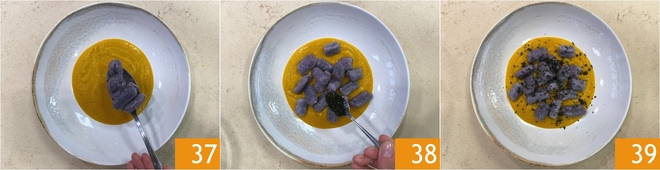 Escorra os nhoques assim que subirem à superfície 34 e transfira-os para a panela com a manteiga derretida 35, depois salteie brevemente para misturá-los. Você está pronto para empratar: distribua o creme de abóbora no fundo dos pratos 36.