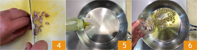 Descasque e pique finamente a cebola 4. Em uma frigideira, coloque um fio de azeite 5 e a cebola 6.