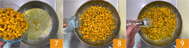 Cozinhe a cebola em fogo baixo por 6-7 minutos e, em seguida, adicione a abóbora 7 e cozinhe por cerca de 15-20 minutos em fogo médio-baixo, adicionando água quente conforme necessário 8. Tempere com sal 9 e pimenta.