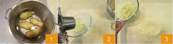 Para preparar os nhoques de farinha de grão-de-bico, a primeira coisa a fazer é colocar as batatas para ferver. Coloque-as em uma panela, cubra com água fria e deixe cozinhar por cerca de 30-40 minutos 1, até que, ao espetá-las com um garfo, estejam macias. Depois, escorra-as e, tomando cuidado para não se queimar, amasse-as ainda quentes em uma tigela 2. Utilizando um espremedor de batatas, você poderá evitar descascá-las, pois a casca ficará dentro. Em seguida, disponha a farinha de grão-de-bico em forma de fonte sobre uma superfície de trabalho e coloque as batatas no centro 3