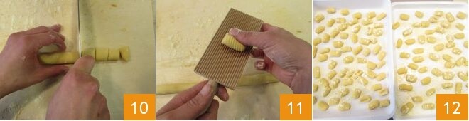 Corte-o em pedaços 10 e, pressionando levemente com o polegar, passe os nhoques sobre o riscador de nhoques para obter a forma clássica 11. Se não tiver um, você pode usar os dentes de um garfo. Continue assim até terminar toda a massa, transferindo os nhoques para uma bandeja bem polvilhada com farinha de grão-de-bico 12. Os nhoques estão prontos para serem cozidos em bastante água fervente e estarão cozidos assim que subirem à superfície.