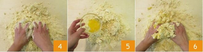 Misture tudo com as mãos 4, depois refaça a fonte e coloque o ovo no centro 5. Trabalhe a mistura novamente 6
