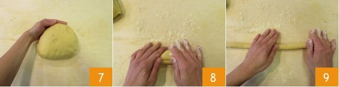 até que você obtenha uma massa uniforme 7. Pegue uma porção e, com as mãos, faça um cilindro 8 com cerca de dois centímetros de espessura 9.