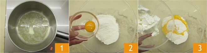 Para preparar os nhoques de fruta tchecos (knedliky), primeiro derreta a manteiga em uma panela e deixe esfriar 1. Enquanto isso, coloque a farinha em uma tigela junto com a gema 2 e a ricota 3.