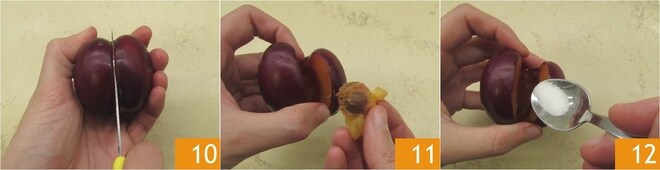 Agora lave as ameixas, faça um corte em um dos lados 10 e retire o caroço, mantendo o restante da fruta intacto 11. Preencha a cavidade central com uma colher de chá de açúcar 12, depois feche a fruta.