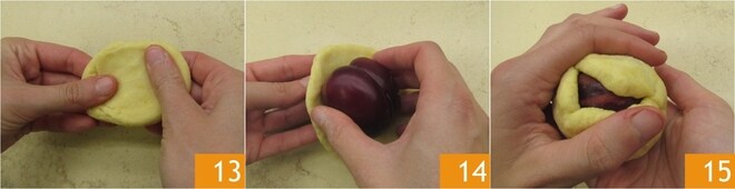 Pegue as bolinhas de massa e alise-as com os dedos para criar discos de espessura uniforme 13. Envolva o disco de massa ao redor da ameixa 14 até cobri-la completamente 15.