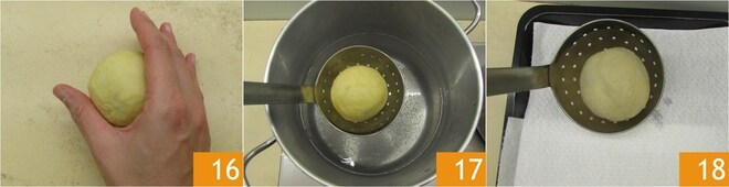 Role a bola na superfície de trabalho para torná-la lisa e uniforme 16. Enquanto repete a mesma operação com o restante das ameixas, leve para ferver uma panela com água ligeiramente salgada. Mergulhe os nhoques com a ajuda de uma escumadeira 17 e deixe cozinhar por cerca de 5 minutos, sem nunca mexer. Quando subirem à superfície, escorra os nhoques e transfira-os para papel absorvente 18.