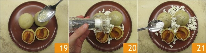 Guarneça os knedliky com manteiga derretida a gosto 19, um pouco de ricota em pedaços, sementes de papoula moídas 20 e açúcar de confeiteiro 21: seus nhoques de fruta tchecos estão prontos para serem saboreados!