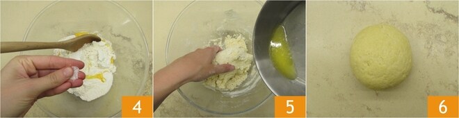 Adicione uma pitada de sal 4 e comece a misturar os ingredientes com uma colher de pau, depois adicione a manteiga derretida 5 e continue a mexer. Transfira a mistura para uma superfície enfarinhada e sove por 5 minutos até obter uma bola firme e lisa 6. Se a mistura ficar muito líquida, você pode adicionar um pouco de farinha, caso contrário, uma gota de leite.