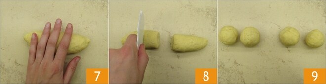 Enfarinhe a superfície de trabalho e divida a massa ao meio, depois forme 2 rolos 7. Divida cada rolo em 5 partes 8 e forme bolinhas 9.