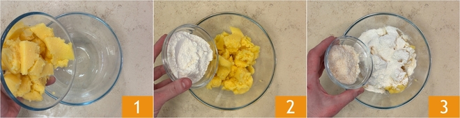 Per preparare gli gnocchi di polenta, iniziate raccogliendo in una ciotola la polenta fredda e ben asciutta, tagliata a pezzi. 1. Unite la farina 2 e il formaggio grattugiato 3.