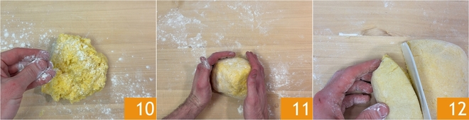 Adicione un pizzico di farina 10 e impastate sino ad ottenere un panetto omogeneo e piuttosto compatto 11. Se dovesse risultare troppo morbido o appiccicoso, potete aggiungere ancora un po di farina. Dividete il panetto in pi porzioni utilizzando un tarocco 12.