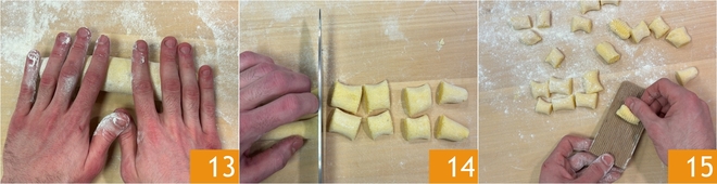 Prendete il primo pezzo di impasto e con le mani formate un filoncino spesso circa 1-2 cm di diametro, a seconda della dimensione desiderata 13. Quindi tagliateli con un coltello o un tarocco a tocchetti di circa 2 cm, proprio come si fa per gli gnocchi classici 14. In ultimo rigate gli gnocchi con l'apposito attrezzo infarinandolo per bene 15. Trasferiteli man mano su un canovaccio ben infarinato e proseguite in questo modo sino a terminare l'impasto. I vostri nhoques di polenta sono pronti per essere cotti e conditi come preferite!