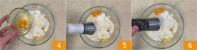 Adicione o ovo 4, poi aggiustate di sale 5 e pepe 6.