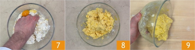 Trabalhe o composto con le mani 7 fino a che le uova saranno ben assorbite 8, poi trasferite l'impasto sul piano di lavoro 9.