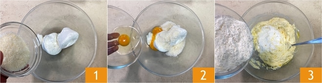 Para preparar os nhoques de ricota com ervilhas, pecorino e guanciale, coloque em uma tigela a ricota, o queijo ralado 11 e os ovos 2. Misture com uma colher para integrar e obter um creme liso, depois incorpore a farinha 3