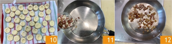 À medida que forma os nhoques, coloque-os, bem espaçados, em uma bandeja forrada com um pano enfarinhado 10. Prepare o molho: corte o guanciale em cubos de 1 cm e coloque em uma frigideira já quente 11. Doure por cerca de 5 minutos ou até que fique crocante e dourado 12.